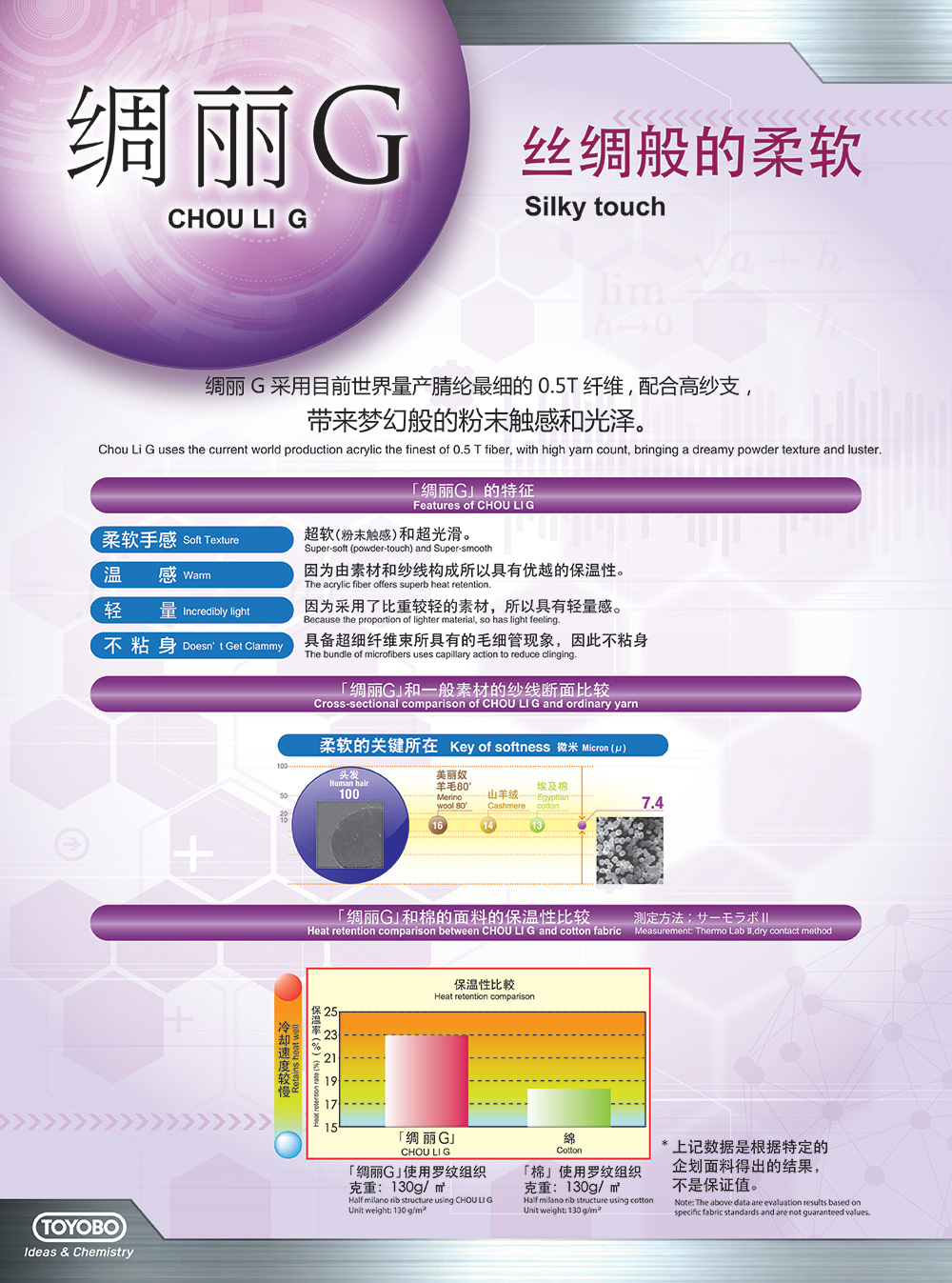 綢麗G采用目前世界量產腈綸最細的0.5T纖維,配合高紗支,帶來夢幻般的粉末觸感和光澤。